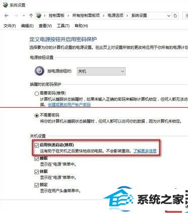 6、配置了能够顺利关机后,你们再开机,在系统配置窗口,左键点击:启用快速启动,在前面小方框内打上勾(不影响关机),再点击保存修改。