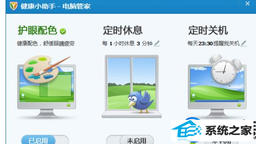 3、打开360安全卫士的健康小助手后,你们可以根据健康小助手提示的进行相应的健康防护措施,首先你们可以开启护眼配色功能,开启后电脑管家会根据颜色搭配出最融合的颜色,方面你们使用电脑阅读文件等。