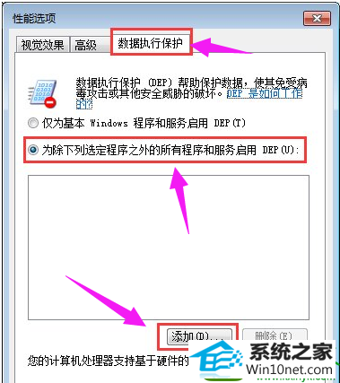 在性能选项窗口,切换到数据执行保护选项,选择“为除下列选定之外的所有程序和服务启用 dEp(U):”选项,之后点击“添加”